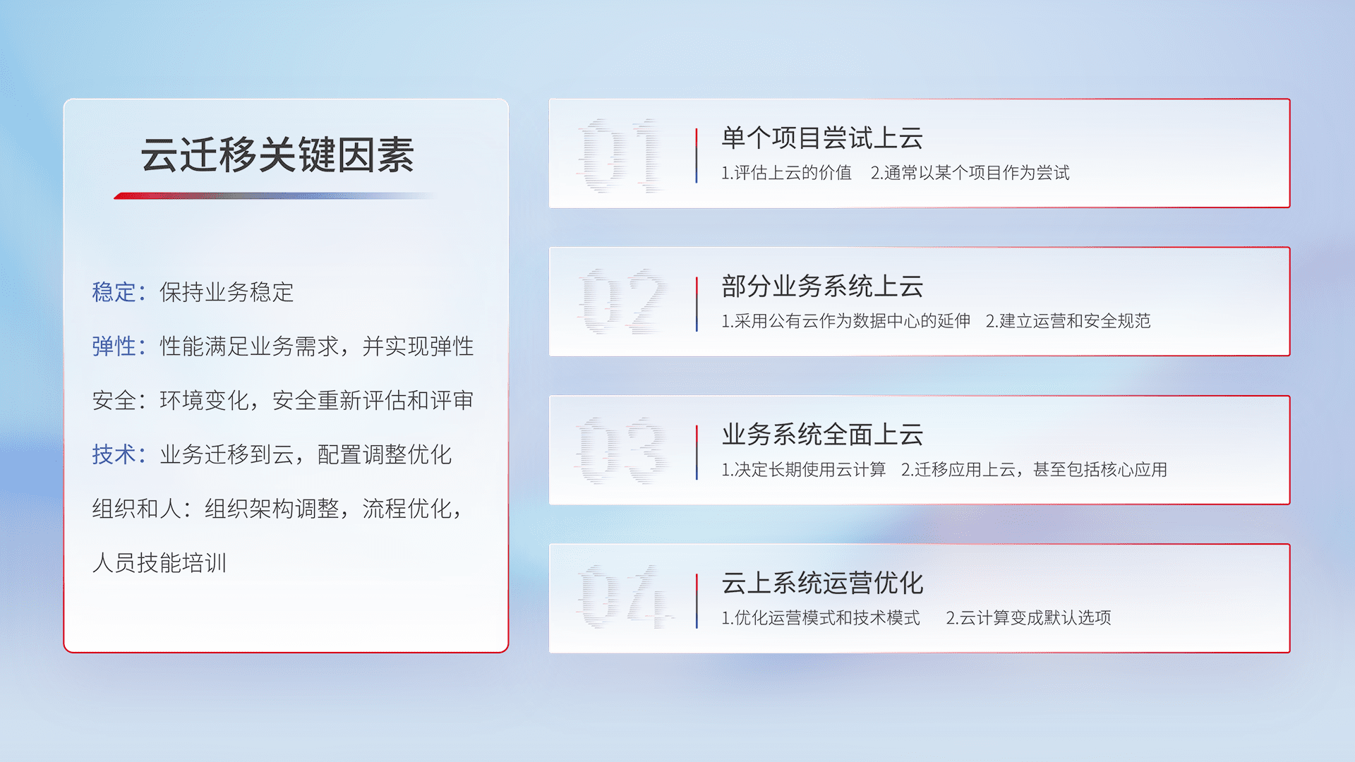结合实际业务,,从规划设计、、、、云平台选型、、云原生改造、、、、数据迁移、、、集成交付,,迁移全过程为客户识别最佳上云路径,,,,做好风险识别管理,,,设计网络架构、、、身份权限、、、、安全审计合规、、操作审计、、、、日志审计、、监控告警策略、、、、多站点容灾设计等,,,,对云上基础设施进行整体规划,,提升IT治理水平,,,,以满足弹性、、高可用、、高性能的需求。。。。